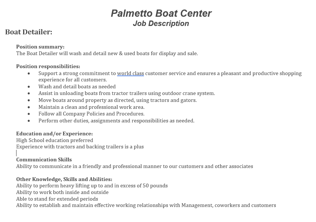 Palmetto Boat Center has an opening for a Boat Detailer.